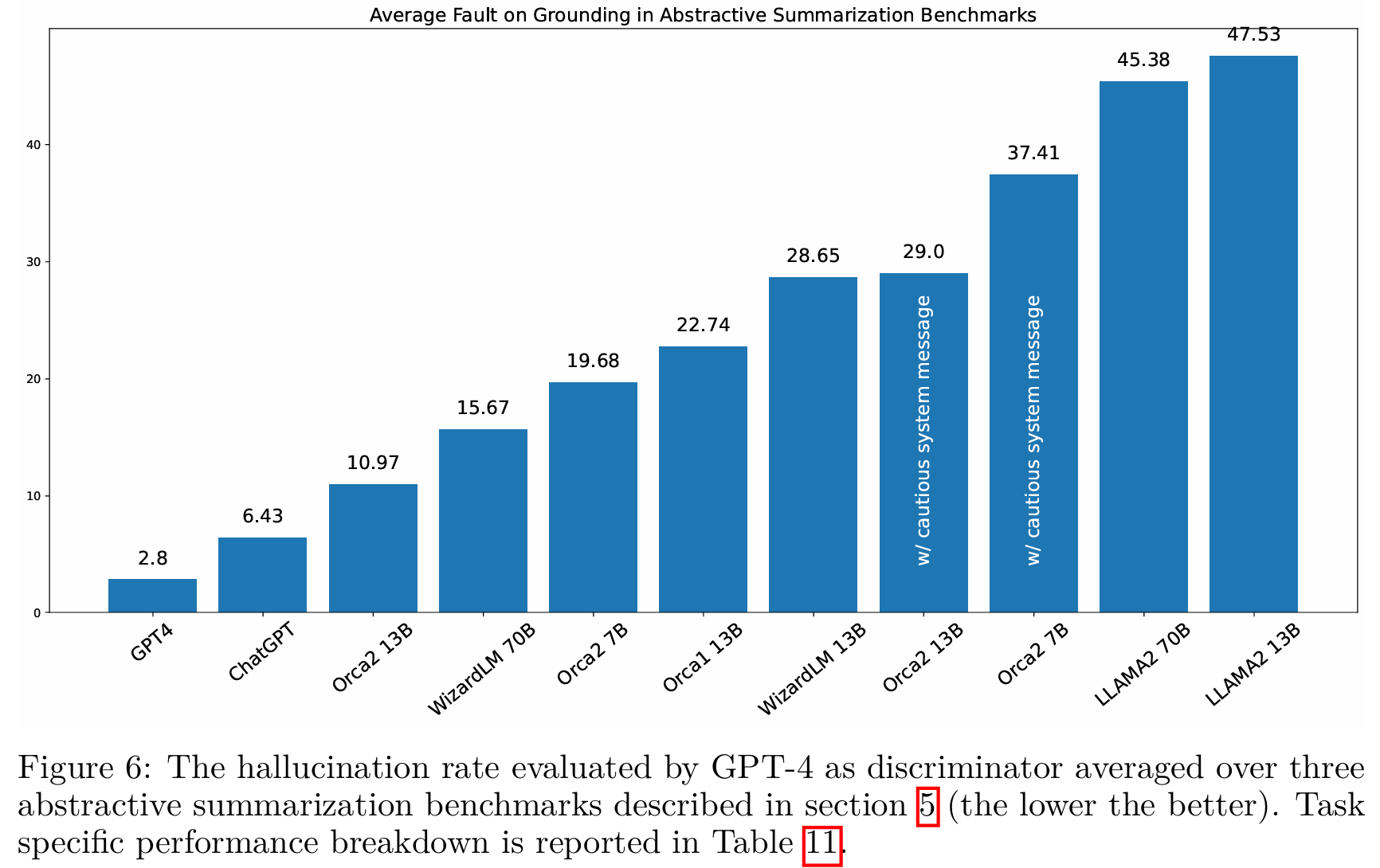 ■ Fig 6은 세 가지 벤치마크에 대해 평균을 낸, 서로 다른 모델들의 hallucination rate이다. Orca-2-13B가 모든 Orca 2 변형 및 다른 13B, 70B LLM들 중에서 가장 낮은 hallucination rate를 보인다.