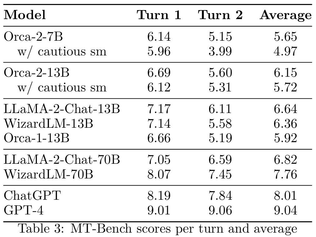 ■ Orca-2-13B는 다른 13B 모델들과 대등한 성능을 보인다. Orca-2-13B의 평균 두 번째 턴 점수는 첫 번째 턴 점수보다 낮은데, 이는 training data에 conversations이 부족하기 때문으로 볼 수 있다.