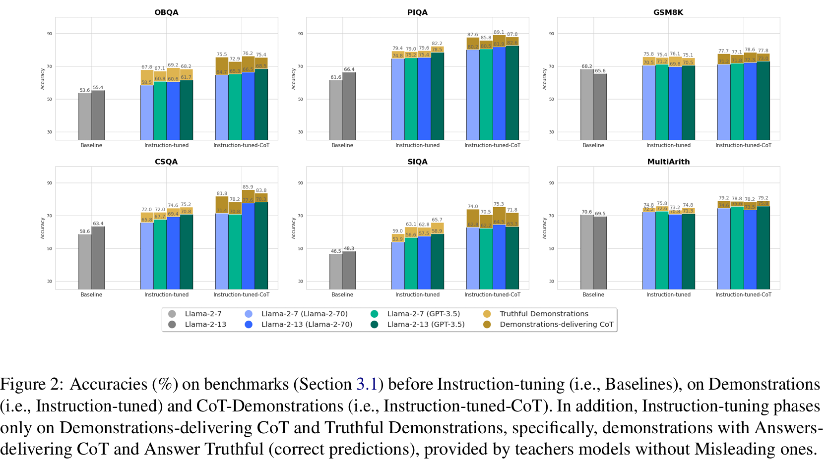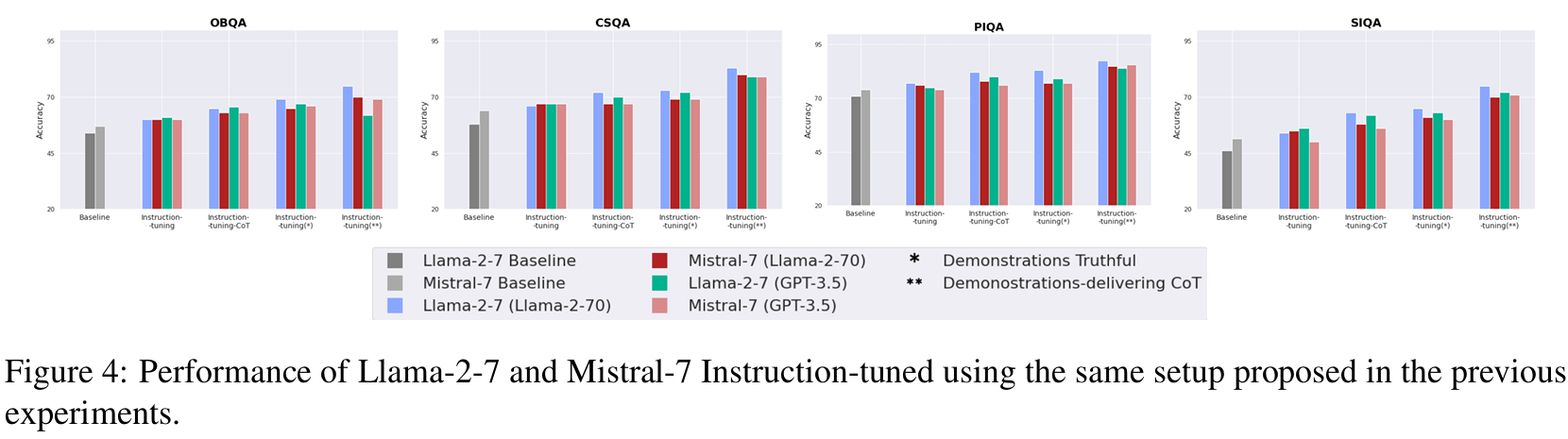 ■ Fig 3에서 Demonstrations Truthful(막대 바로 표시됨)과 Demonstrations-delivering CoT(선으로 표시됨)로 instructed된 students이 overall Demonstrations으로 instructed된 students보다 우수한 성능을 보임을 확인할 수 있다.