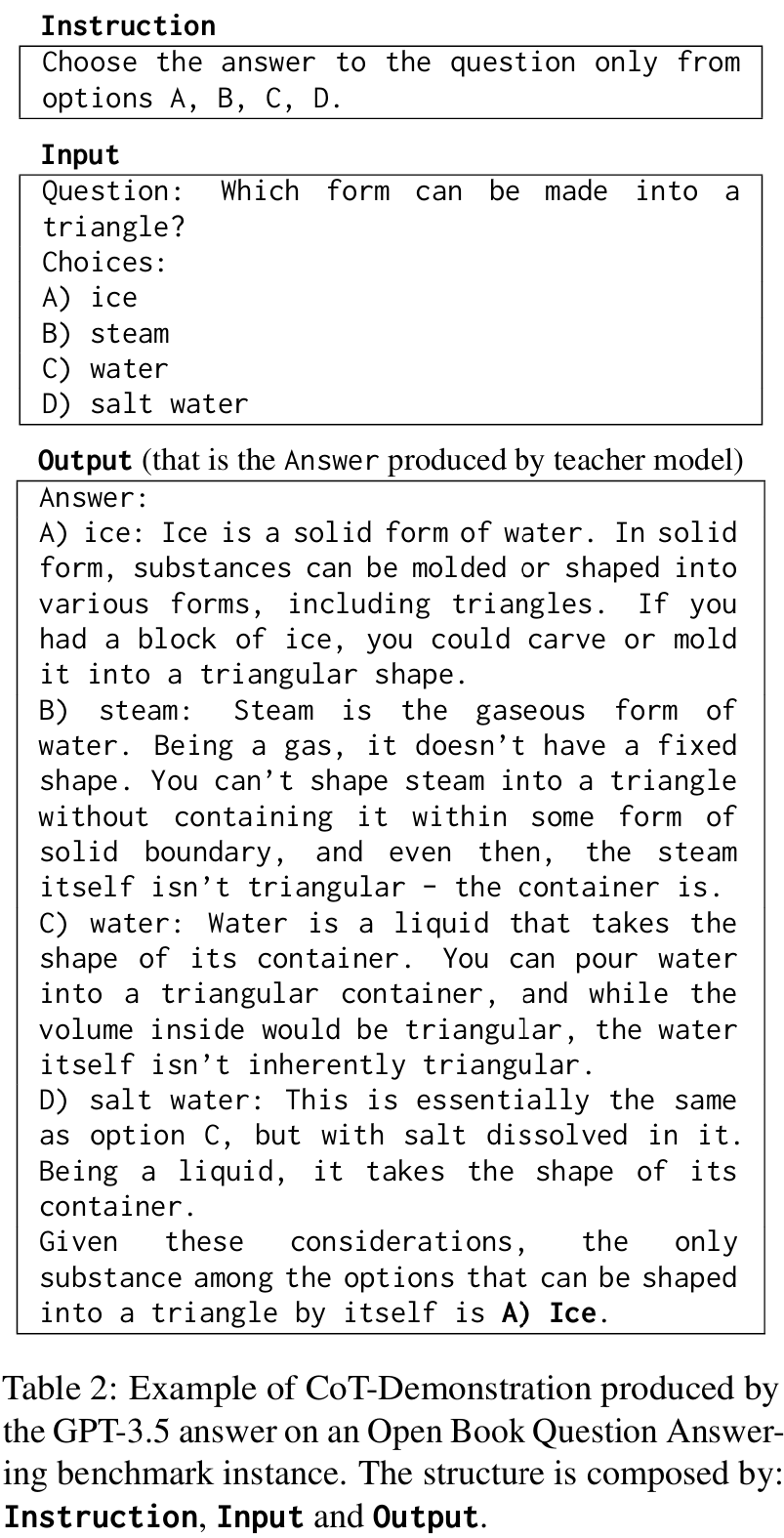 ■ SLMs은 섹션 2.2에서 설명한 대로 teacher가 생성한 answers을 포함하고 있는 Demonstrations로 instructed된다. (Table 2는 CoT-Demonstration의 예시)