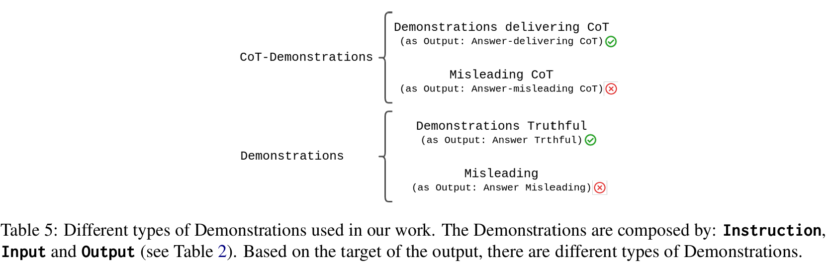 ■ CoT-Demonstration을 "Answers-delivering CoT (올바른 CoT prediction)"에서 비롯된 "Demonstrations-delivering CoT"와 "Misleading CoT (wrong CoT predictions)"에서 비롯된 "Demonstrations-misleading CoT"로 구별한다. 그리고 비교를 위해, CoT prompting이 없는 base Demonstrations을 사용한다.